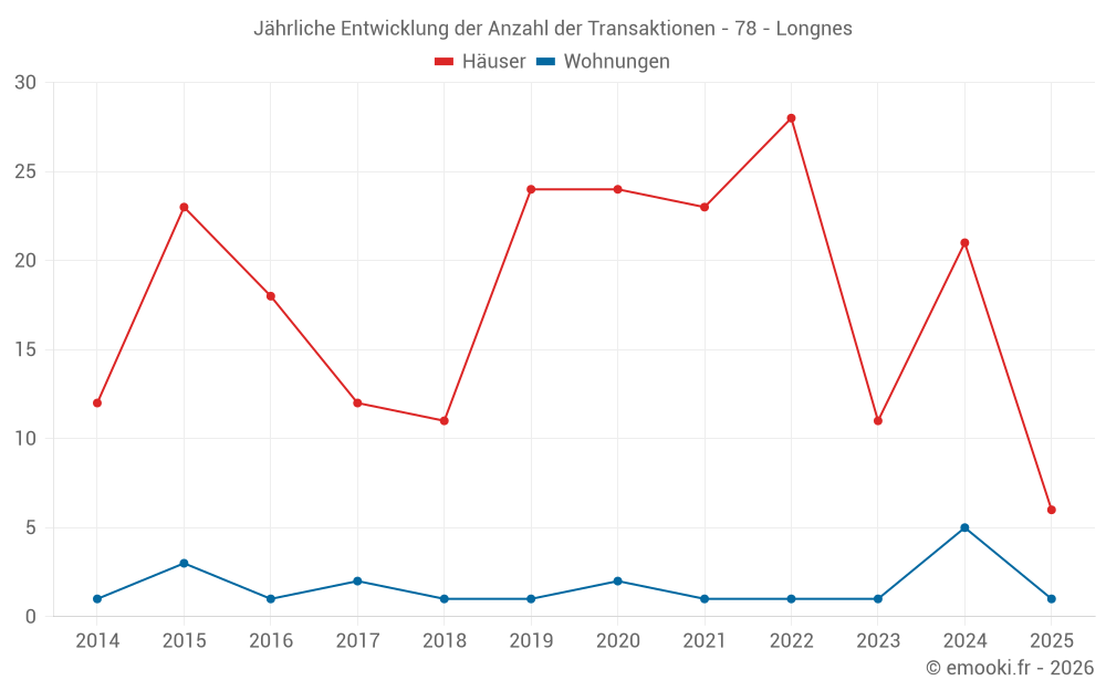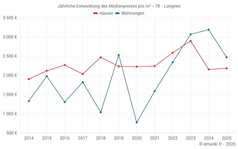 Der Durchschnittspreis auf den 18 Hausgeschäften der letzten 12 Monate in der Gemeinde Longnes betrug 1 997 € pro Quadratmeter für einen mittleren Immobilienwert von 230 000 €. Über diesen Zeitraum hinweg lagen 60% der Transaktionen zwischen 1 637 und 2 743 € pro Quadratmeter (vom 2. bis zum 8. Dezil).