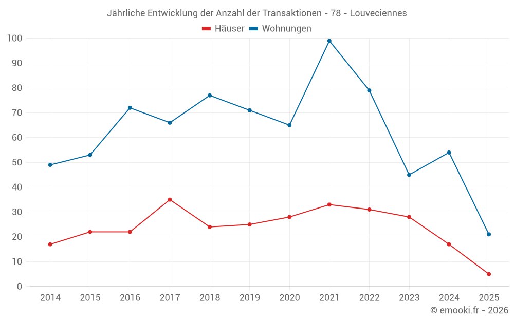 Der Durchschnittspreis auf den 17 Hausgeschäften der letzten 12 Monate in der Gemeinde Louveciennes betrug 5 714 € pro Quadratmeter für einen mittleren Immobilienwert von 855 000 €. Über diesen Zeitraum hinweg lagen 60% der Transaktionen zwischen 4 672 und 6 503 € pro Quadratmeter (vom 2. bis zum 8. Dezil).