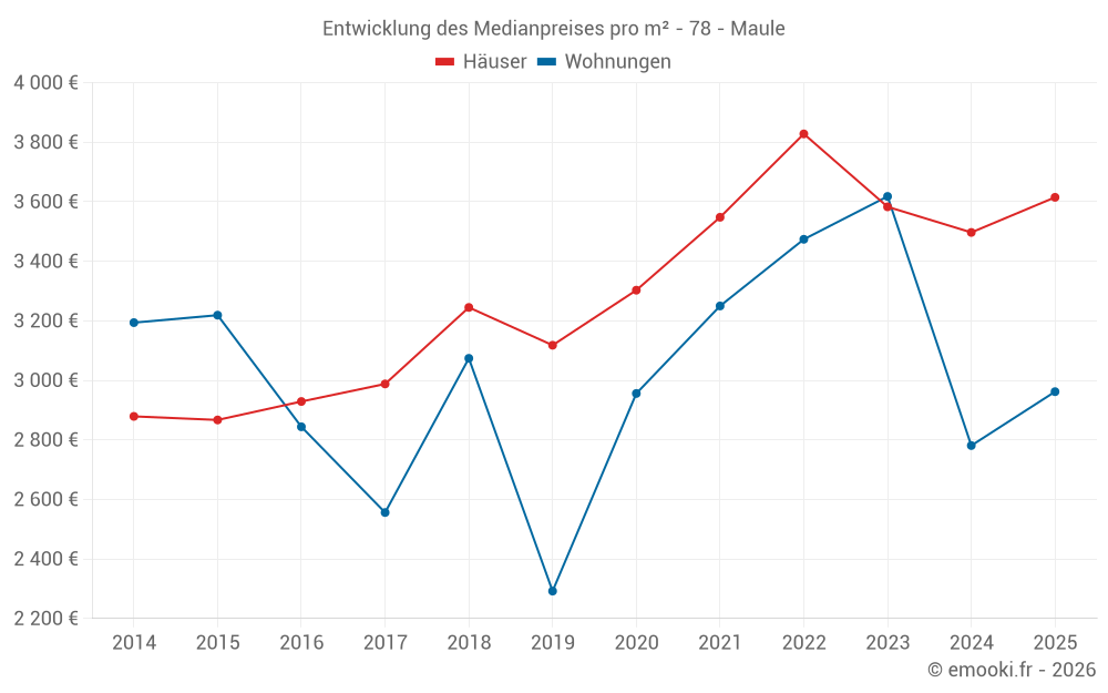 Der Durchschnittspreis auf den 25 Hausgeschäften der letzten 6 Monate in der Gemeinde Maule betrug 3 615 € pro Quadratmeter für einen mittleren Immobilienwert von 345 000 €. Über diesen Zeitraum hinweg lagen 60% der Transaktionen zwischen 2 915 und 4 428 € pro Quadratmeter (vom 2. bis zum 8. Dezil).