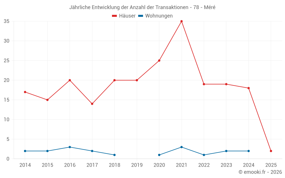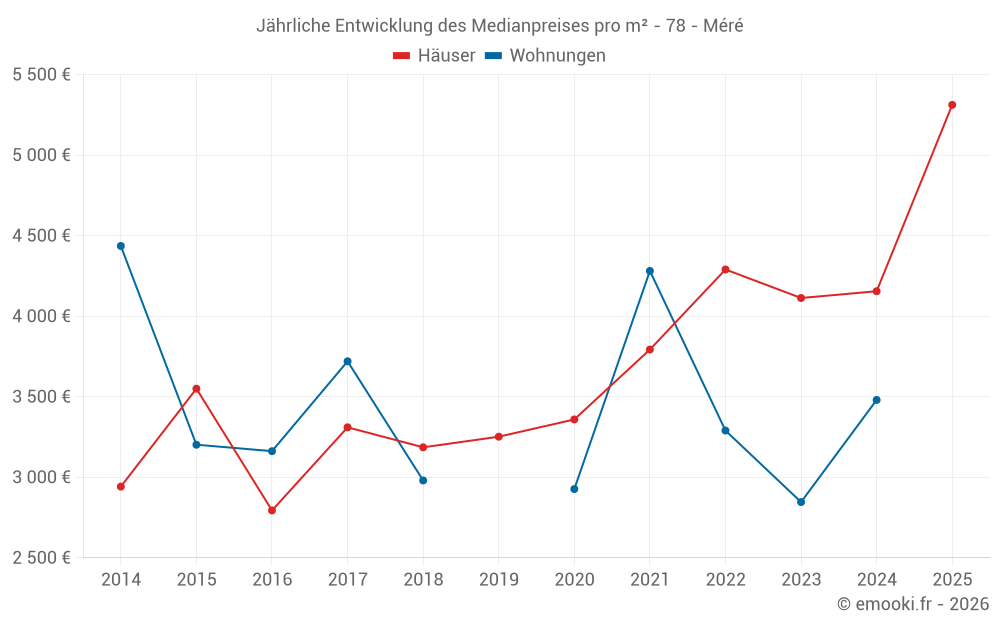 Der Durchschnittspreis auf den 27 Hausgeschäften der letzten 24 Monate in der Gemeinde Méré betrug 4 147 € pro Quadratmeter für einen mittleren Immobilienwert von 473 000 €. Über diesen Zeitraum hinweg lagen 60% der Transaktionen zwischen 3 381 und 4 955 € pro Quadratmeter (vom 2. bis zum 8. Dezil).