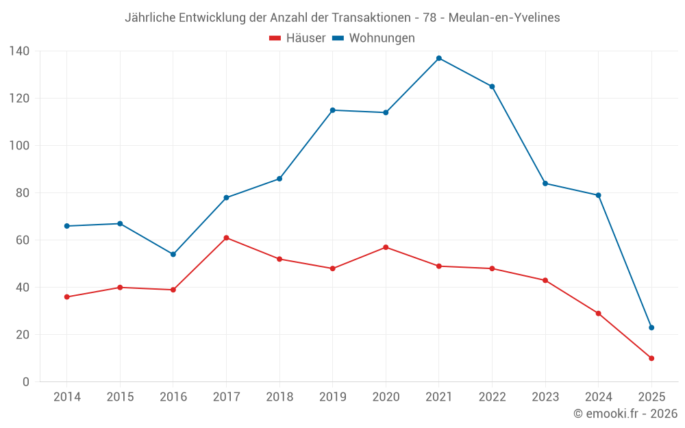 Der Durchschnittspreis auf den 29 Hausgeschäften der letzten 12 Monate in der Gemeinde Meulan-en-Yvelines betrug 2 805 € pro Quadratmeter für einen mittleren Immobilienwert von 237 000 €. Über diesen Zeitraum hinweg lagen 60% der Transaktionen zwischen 2 439 und 3 243 € pro Quadratmeter (vom 2. bis zum 8. Dezil).