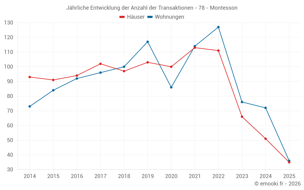 Der Durchschnittspreis auf den 35 Hausgeschäften der letzten 6 Monate in der Gemeinde Montesson betrug 5 083 € pro Quadratmeter für einen mittleren Immobilienwert von 538 000 €. Über diesen Zeitraum hinweg lagen 60% der Transaktionen zwischen 4 285 und 5 758 € pro Quadratmeter (vom 2. bis zum 8. Dezil).