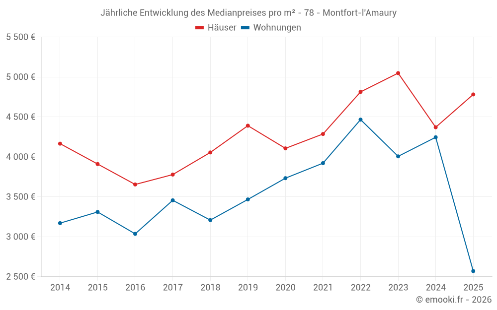 Der Durchschnittspreis auf den 18 Wohnungstransaktionen der letzten 24 Monate in der Gemeinde Montfort-l'Amaury betrug 3 899 € pro Quadratmeter für einen mittleren Immobilienwert von 211 000 €. Über diesen Zeitraum hinweg lagen 60% der Transaktionen zwischen 2 693 und 5 057 € pro Quadratmeter (vom 2. bis zum 8. Dezil).