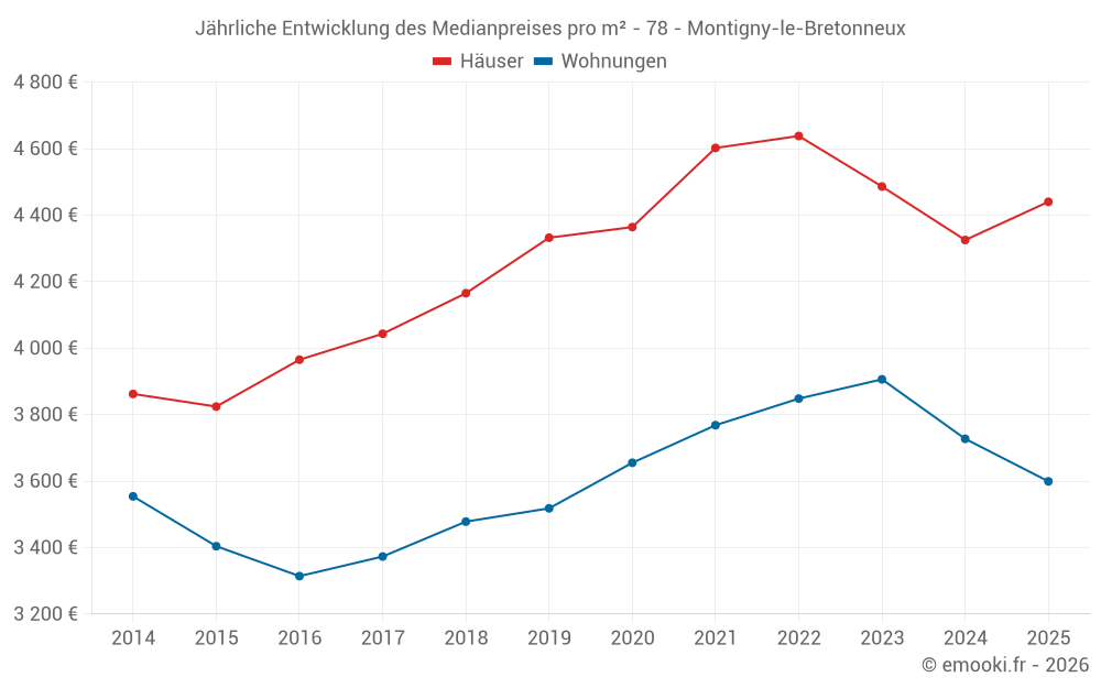 Der Durchschnittspreis auf den 28 Hausgeschäften der letzten 6 Monate in der Gemeinde Montigny-le-Bretonneux betrug 4 440 € pro Quadratmeter für einen mittleren Immobilienwert von 435 500 €. Über diesen Zeitraum hinweg lagen 60% der Transaktionen zwischen 4 001 und 5 084 € pro Quadratmeter (vom 2. bis zum 8. Dezil).