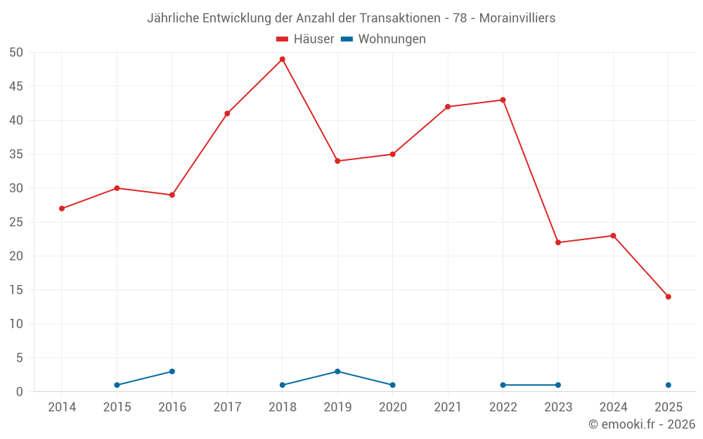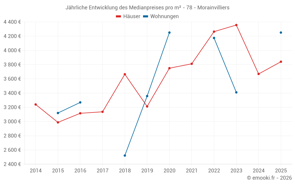 Der Durchschnittspreis auf den 25 Hausgeschäften der letzten 12 Monate in der Gemeinde Morainvilliers betrug 3 887 € pro Quadratmeter für einen mittleren Immobilienwert von 540 000 €. Über diesen Zeitraum hinweg lagen 60% der Transaktionen zwischen 3 225 und 4 328 € pro Quadratmeter (vom 2. bis zum 8. Dezil).