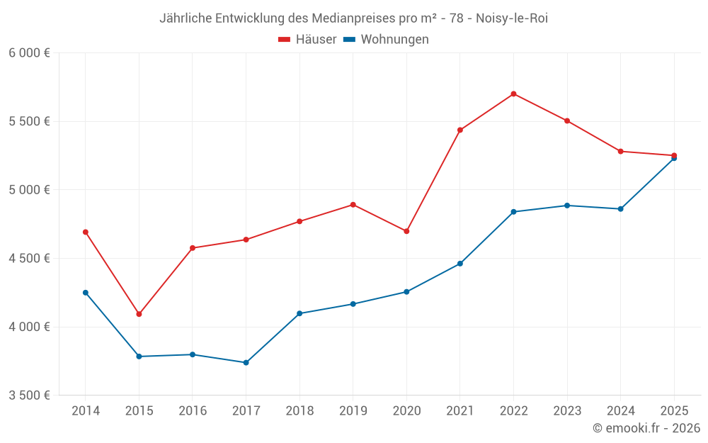 Der Durchschnittspreis auf den 17 Wohnungstransaktionen der letzten 12 Monate in der Gemeinde Noisy-le-Roi betrug 5 098 € pro Quadratmeter für einen mittleren Immobilienwert von 405 000 €. Über diesen Zeitraum hinweg lagen 60% der Transaktionen zwischen 3 863 und 5 784 € pro Quadratmeter (vom 2. bis zum 8. Dezil).