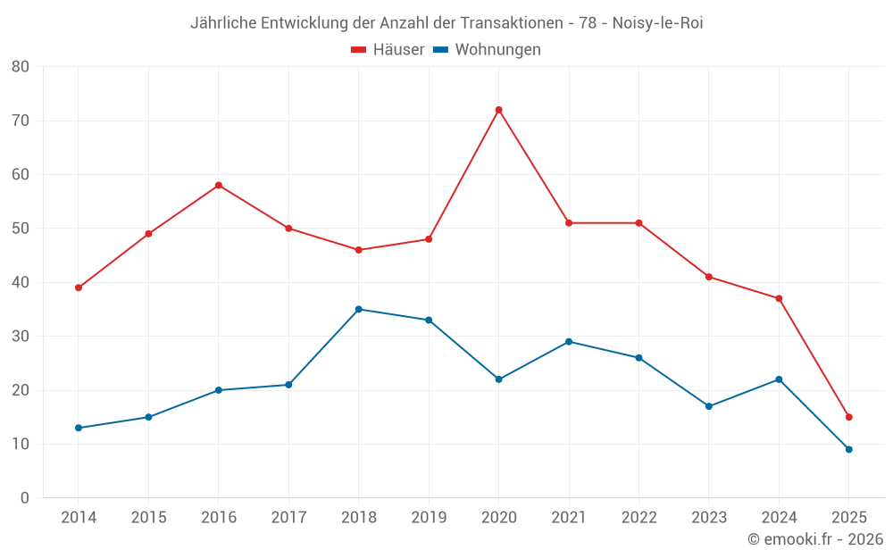 Der Durchschnittspreis auf den 42 Hausgeschäften der letzten 12 Monate in der Gemeinde Noisy-le-Roi betrug 5 282 € pro Quadratmeter für einen mittleren Immobilienwert von 747 900 €. Über diesen Zeitraum hinweg lagen 60% der Transaktionen zwischen 4 525 und 6 666 € pro Quadratmeter (vom 2. bis zum 8. Dezil).