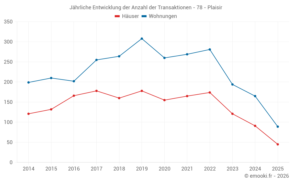 Der Durchschnittspreis auf den 21 Hausgeschäften der letzten 3 Monate in der Gemeinde Plaisir betrug 3 375 € pro Quadratmeter für einen mittleren Immobilienwert von 350 000 €. Über diesen Zeitraum hinweg lagen 60% der Transaktionen zwischen 2 880 und 3 734 € pro Quadratmeter (vom 2. bis zum 8. Dezil).