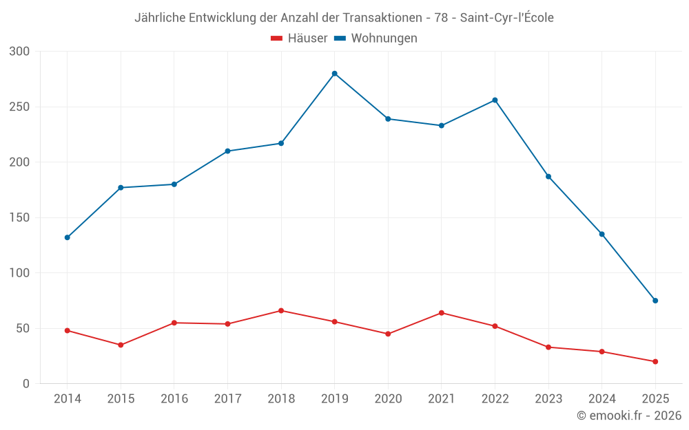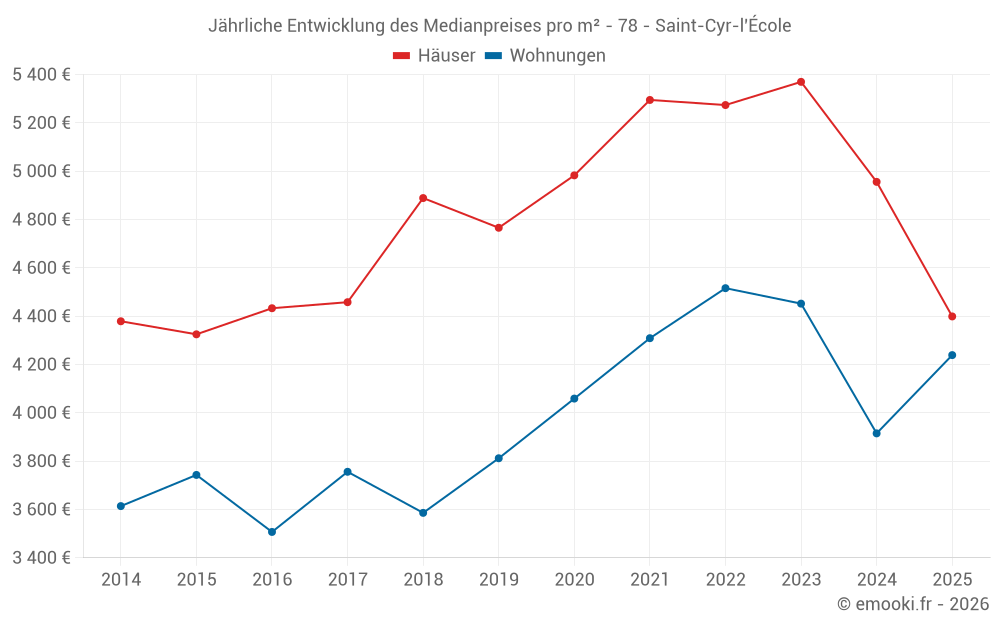 Der Durchschnittspreis auf den 20 Hausgeschäften der letzten 6 Monate in der Gemeinde Saint-Cyr-l'École betrug 4 399 € pro Quadratmeter für einen mittleren Immobilienwert von 451 000 €. Über diesen Zeitraum hinweg lagen 60% der Transaktionen zwischen 3 674 und 5 329 € pro Quadratmeter (vom 2. bis zum 8. Dezil).