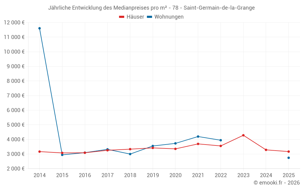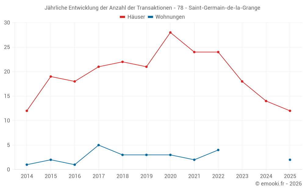 Der Durchschnittspreis auf den 23 Hausgeschäften der letzten 12 Monate in der Gemeinde Saint-Germain-de-la-Grange betrug 3 264 € pro Quadratmeter für einen mittleren Immobilienwert von 415 000 €. Über diesen Zeitraum hinweg lagen 60% der Transaktionen zwischen 2 970 und 3 887 € pro Quadratmeter (vom 2. bis zum 8. Dezil).