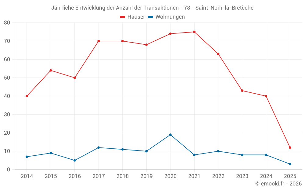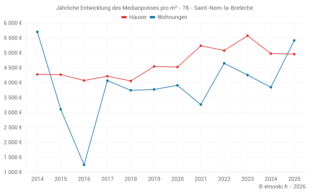 Der Durchschnittspreis auf den 16 Wohnungstransaktionen der letzten 24 Monate in der Gemeinde Saint-Nom-la-Bretèche betrug 4 306 € pro Quadratmeter für einen mittleren Immobilienwert von 425 575 €. Über diesen Zeitraum hinweg lagen 60% der Transaktionen zwischen 3 599 und 5 527 € pro Quadratmeter (vom 2. bis zum 8. Dezil).
