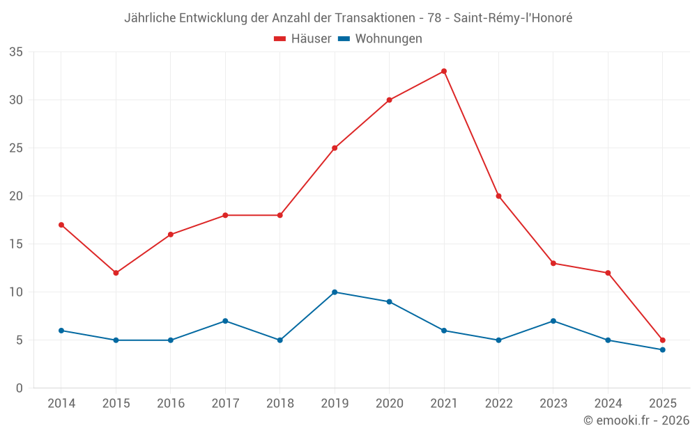 Der Durchschnittspreis auf den 21 Hausgeschäften der letzten 24 Monate in der Gemeinde Saint-Rémy-l'Honoré betrug 3 733 € pro Quadratmeter für einen mittleren Immobilienwert von 399 000 €. Über diesen Zeitraum hinweg lagen 60% der Transaktionen zwischen 2 711 und 4 671 € pro Quadratmeter (vom 2. bis zum 8. Dezil).