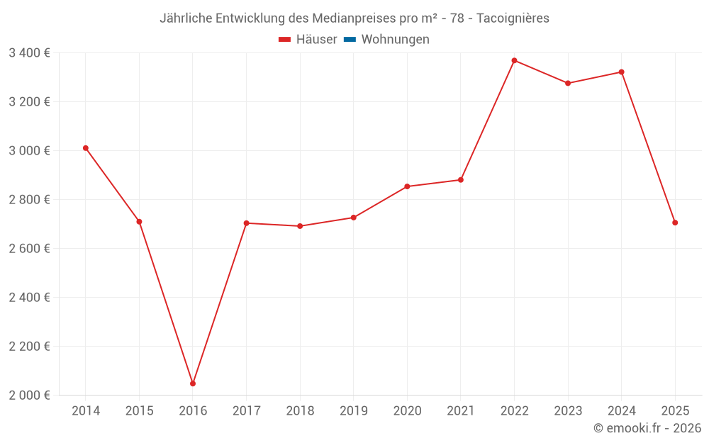 Der Durchschnittspreis auf den 21 Hausgeschäften der letzten 24 Monate in der Gemeinde Tacoignières betrug 3 258 € pro Quadratmeter für einen mittleren Immobilienwert von 305 800 €. Über diesen Zeitraum hinweg lagen 60% der Transaktionen zwischen 2 658 und 3 945 € pro Quadratmeter (vom 2. bis zum 8. Dezil).