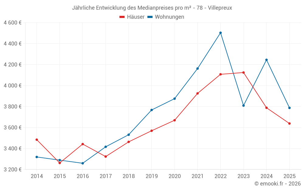 Der Durchschnittspreis auf den 22 Wohnungstransaktionen der letzten 6 Monate in der Gemeinde Villepreux betrug 3 788 € pro Quadratmeter für einen mittleren Immobilienwert von 229 250 €. Über diesen Zeitraum hinweg lagen 60% der Transaktionen zwischen 3 135 und 4 496 € pro Quadratmeter (vom 2. bis zum 8. Dezil).