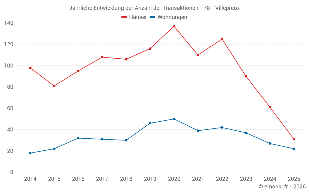 Der Durchschnittspreis auf den 31 Hausgeschäften der letzten 6 Monate in der Gemeinde Villepreux betrug 3 639 € pro Quadratmeter für einen mittleren Immobilienwert von 315 100 €. Über diesen Zeitraum hinweg lagen 60% der Transaktionen zwischen 3 038 und 4 125 € pro Quadratmeter (vom 2. bis zum 8. Dezil).