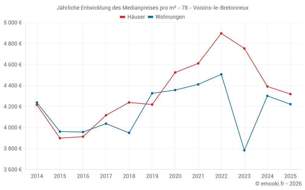 Der Durchschnittspreis auf den 28 Hausgeschäften der letzten 6 Monate in der Gemeinde Voisins-le-Bretonneux betrug 4 320 € pro Quadratmeter für einen mittleren Immobilienwert von 477 650 €. Über diesen Zeitraum hinweg lagen 60% der Transaktionen zwischen 3 614 und 4 609 € pro Quadratmeter (vom 2. bis zum 8. Dezil).