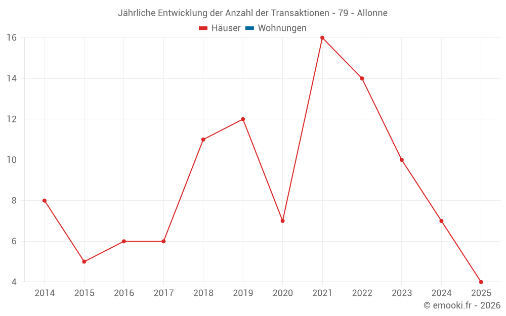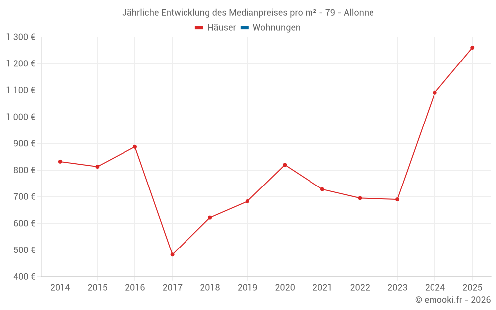 Der Durchschnittspreis auf den 15 Hausgeschäften der letzten 24 Monate in der Gemeinde Allonne betrug 1 026 € pro Quadratmeter für einen mittleren Immobilienwert von 124 560 €. Über diesen Zeitraum hinweg lagen 60% der Transaktionen zwischen 553 und 1 522 € pro Quadratmeter (vom 2. bis zum 8. Dezil).