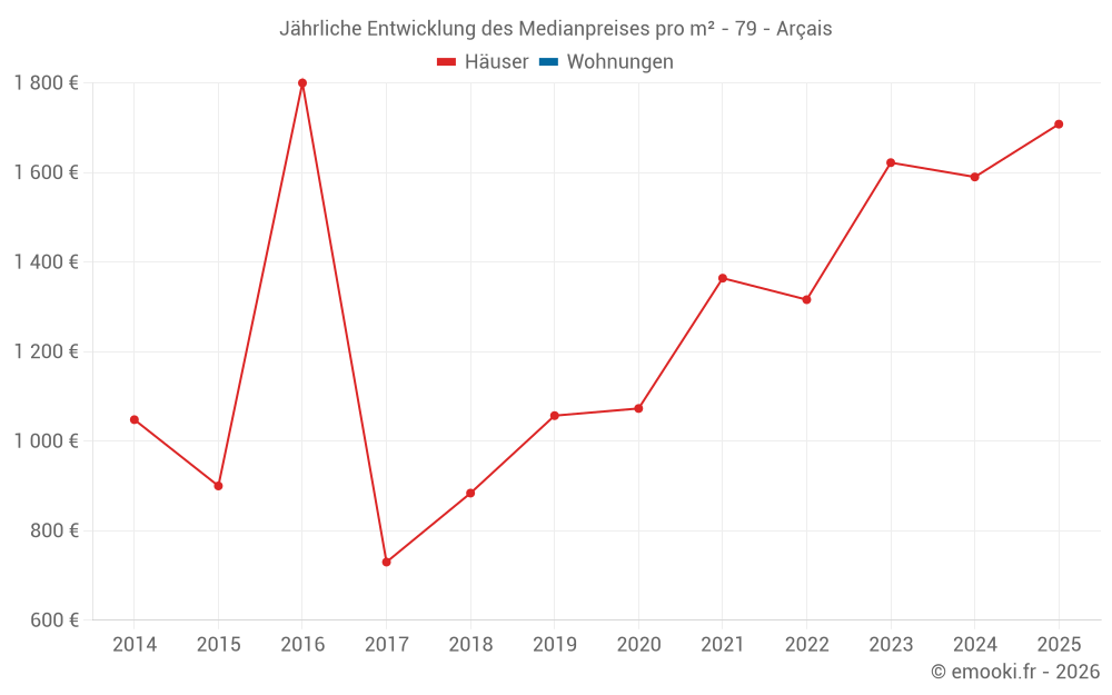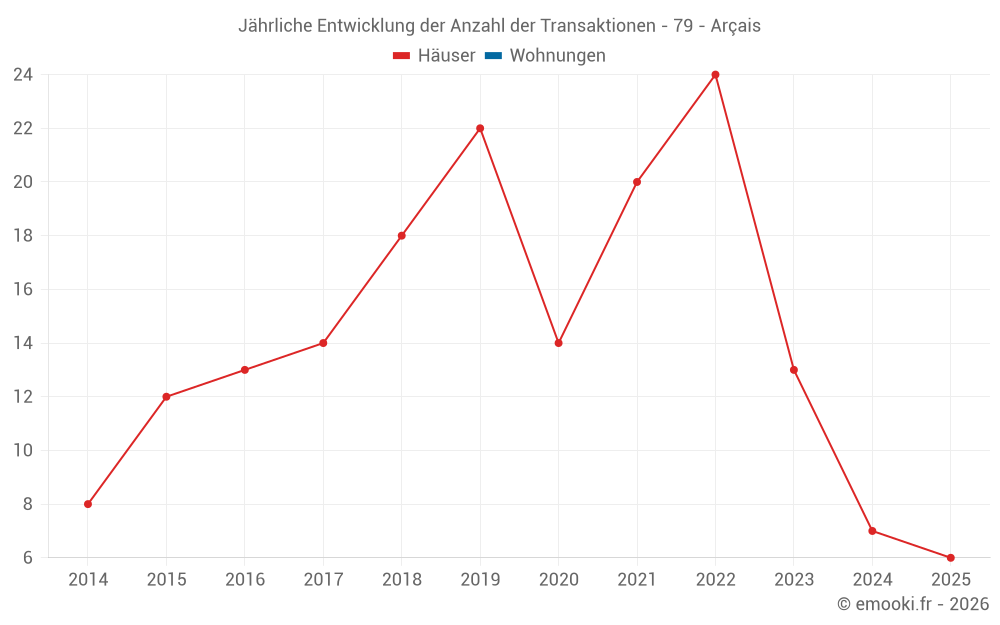Der Durchschnittspreis auf den 20 Hausgeschäften der letzten 24 Monate in der Gemeinde Arçais betrug 1 596 € pro Quadratmeter für einen mittleren Immobilienwert von 135 628 €. Über diesen Zeitraum hinweg lagen 60% der Transaktionen zwischen 1 246 und 2 094 € pro Quadratmeter (vom 2. bis zum 8. Dezil).