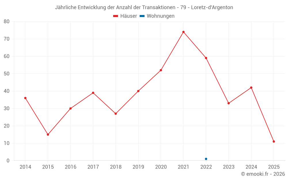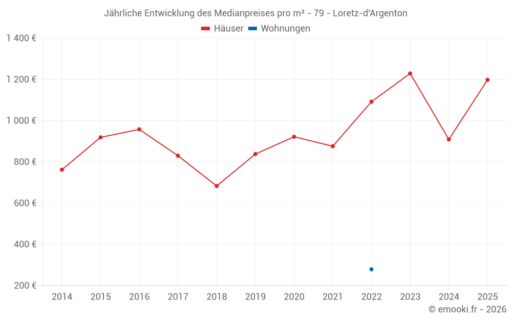Der Durchschnittspreis auf den 32 Hausgeschäften der letzten 12 Monate in der Gemeinde Loretz-d'Argenton betrug 982 € pro Quadratmeter für einen mittleren Immobilienwert von 92 900 €. Über diesen Zeitraum hinweg lagen 60% der Transaktionen zwischen 562 und 1 386 € pro Quadratmeter (vom 2. bis zum 8. Dezil).