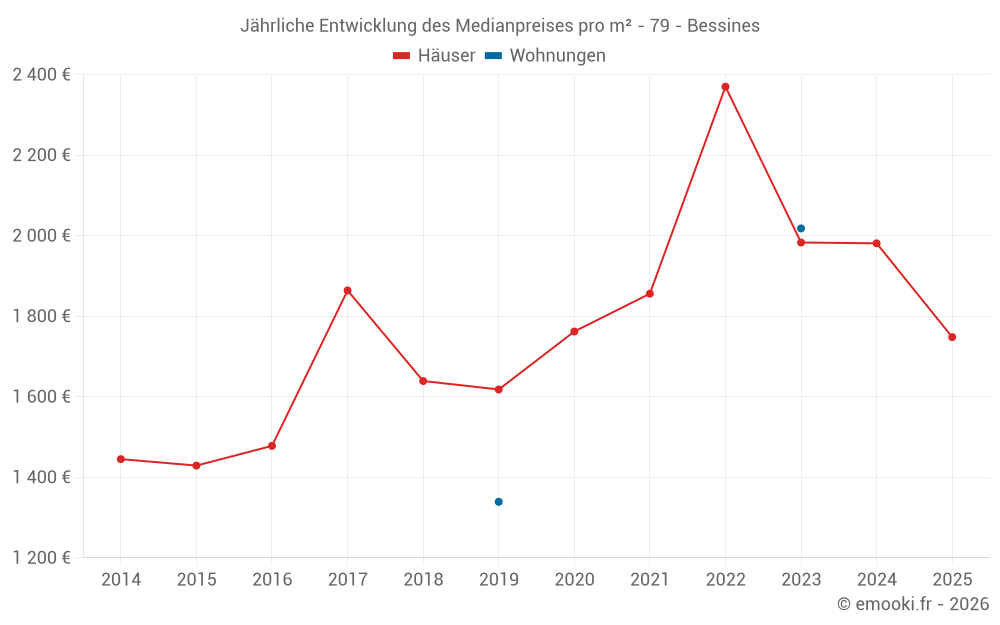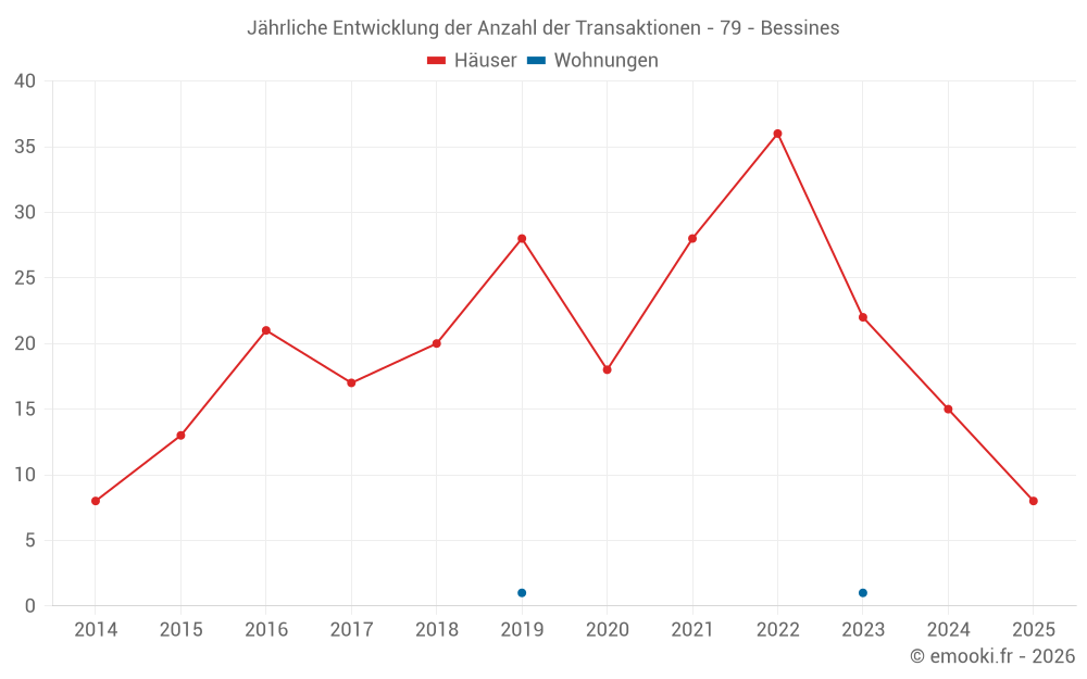 Der Durchschnittspreis auf den 18 Hausgeschäften der letzten 12 Monate in der Gemeinde Bessines betrug 1 862 € pro Quadratmeter für einen mittleren Immobilienwert von 204 500 €. Über diesen Zeitraum hinweg lagen 60% der Transaktionen zwischen 1 534 und 2 461 € pro Quadratmeter (vom 2. bis zum 8. Dezil).