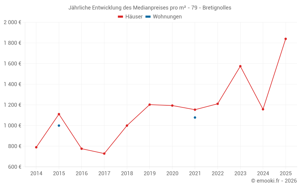 Der Durchschnittspreis auf den 22 Hausgeschäften der letzten 24 Monate in der Gemeinde Bretignolles betrug 1 482 € pro Quadratmeter für einen mittleren Immobilienwert von 144 305 €. Über diesen Zeitraum hinweg lagen 60% der Transaktionen zwischen 948 und 1 933 € pro Quadratmeter (vom 2. bis zum 8. Dezil).