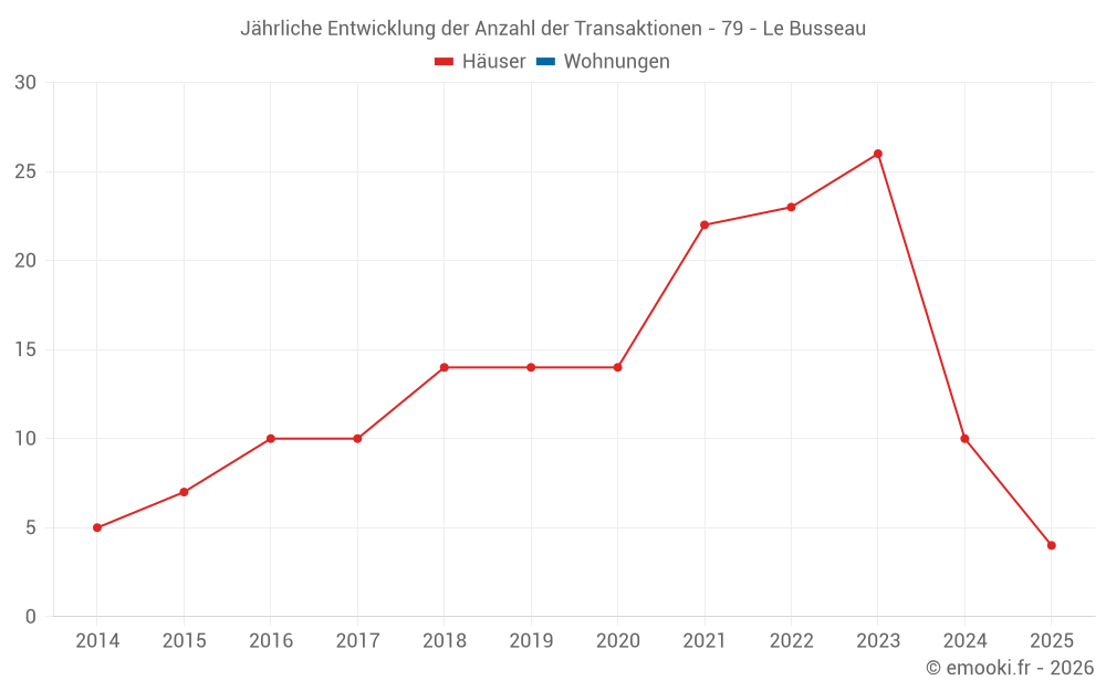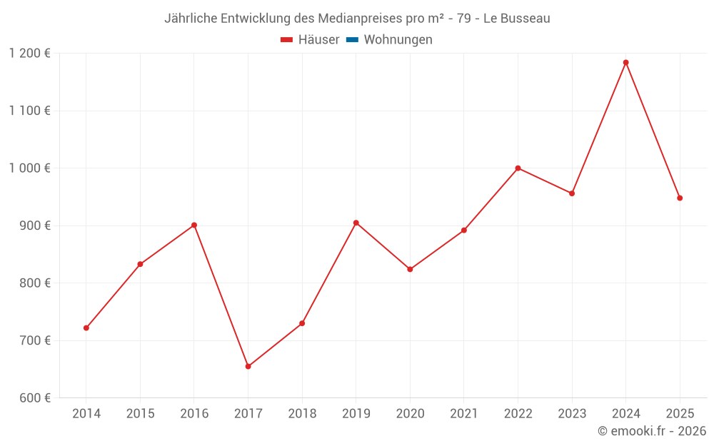 Der Durchschnittspreis auf den 25 Hausgeschäften der letzten 24 Monate in der Gemeinde Le Busseau betrug 1 037 € pro Quadratmeter für einen mittleren Immobilienwert von 97 500 €. Über diesen Zeitraum hinweg lagen 60% der Transaktionen zwischen 610 und 1 443 € pro Quadratmeter (vom 2. bis zum 8. Dezil).
