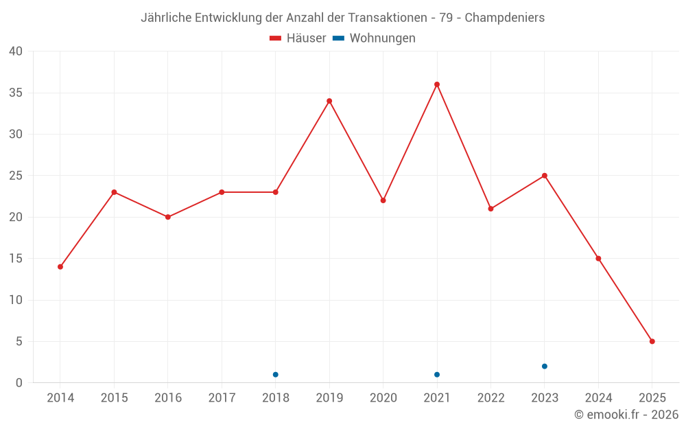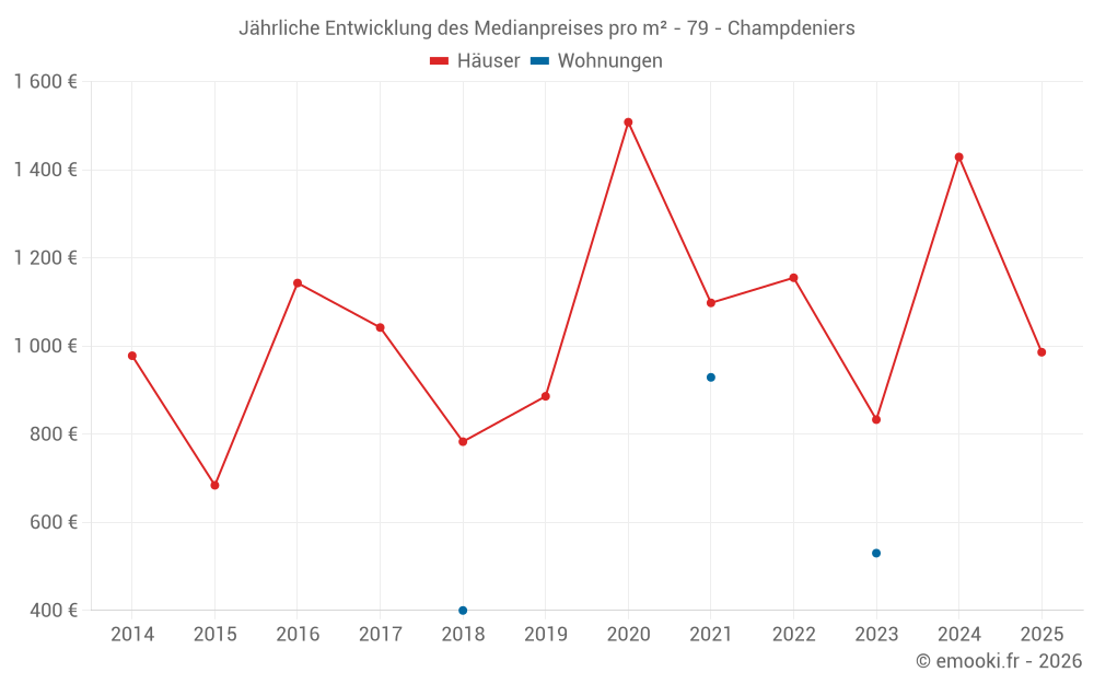 Der Durchschnittspreis auf den 31 Hausgeschäften der letzten 24 Monate in der Gemeinde Champdeniers betrug 1 170 € pro Quadratmeter für einen mittleren Immobilienwert von 127 610 €. Über diesen Zeitraum hinweg lagen 60% der Transaktionen zwischen 709 und 1 619 € pro Quadratmeter (vom 2. bis zum 8. Dezil).