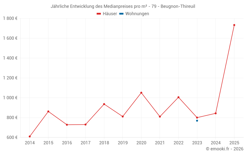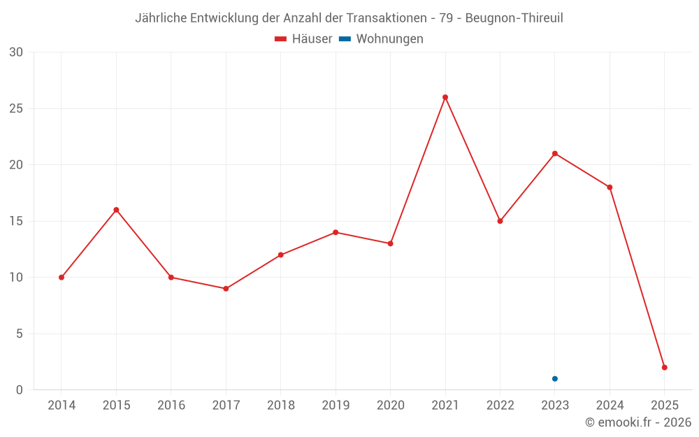 Der Durchschnittspreis auf den 28 Hausgeschäften der letzten 24 Monate in der Gemeinde Beugnon-Thireuil betrug 863 € pro Quadratmeter für einen mittleren Immobilienwert von 98 800 €. Über diesen Zeitraum hinweg lagen 60% der Transaktionen zwischen 464 und 1 298 € pro Quadratmeter (vom 2. bis zum 8. Dezil).