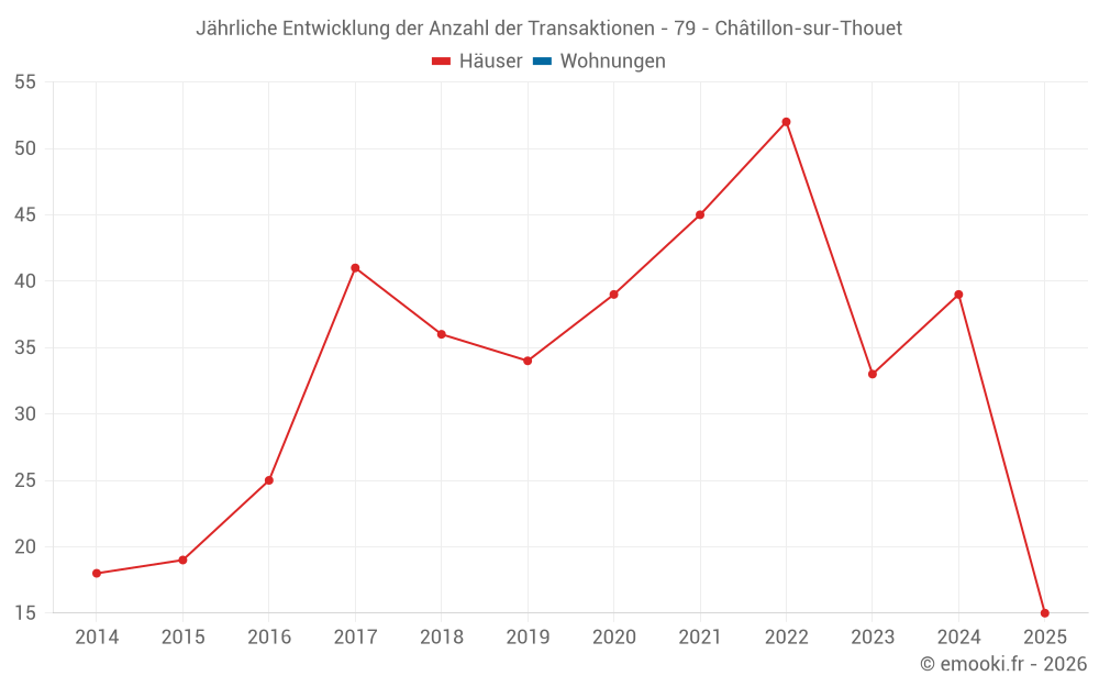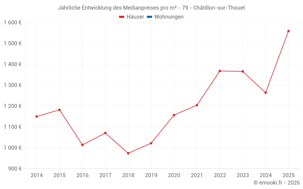 Der Durchschnittspreis auf den 34 Hausgeschäften der letzten 12 Monate in der Gemeinde Châtillon-sur-Thouet betrug 1 476 € pro Quadratmeter für einen mittleren Immobilienwert von 117 500 €. Über diesen Zeitraum hinweg lagen 60% der Transaktionen zwischen 1 077 und 1 800 € pro Quadratmeter (vom 2. bis zum 8. Dezil).