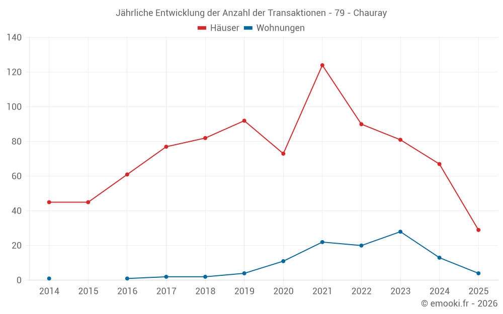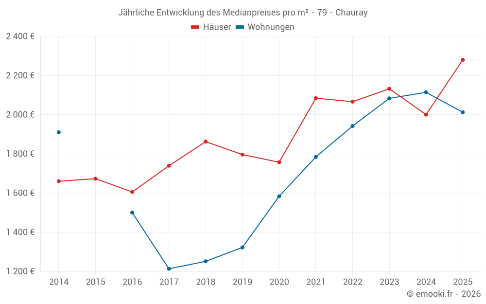Der Durchschnittspreis auf den 29 Hausgeschäften der letzten 6 Monate in der Gemeinde Chauray betrug 2 280 € pro Quadratmeter für einen mittleren Immobilienwert von 222 000 €. Über diesen Zeitraum hinweg lagen 60% der Transaktionen zwischen 1 477 und 2 650 € pro Quadratmeter (vom 2. bis zum 8. Dezil).