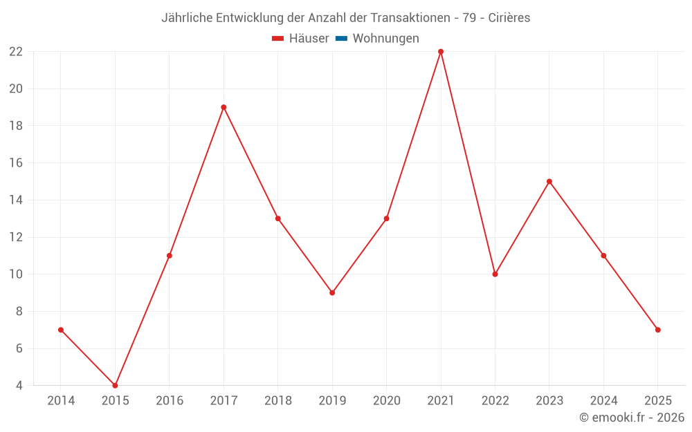 Der Durchschnittspreis auf den 16 Hausgeschäften der letzten 12 Monate in der Gemeinde Cirières betrug 1 058 € pro Quadratmeter für einen mittleren Immobilienwert von 131 500 €. Über diesen Zeitraum hinweg lagen 60% der Transaktionen zwischen 828 und 1 720 € pro Quadratmeter (vom 2. bis zum 8. Dezil).