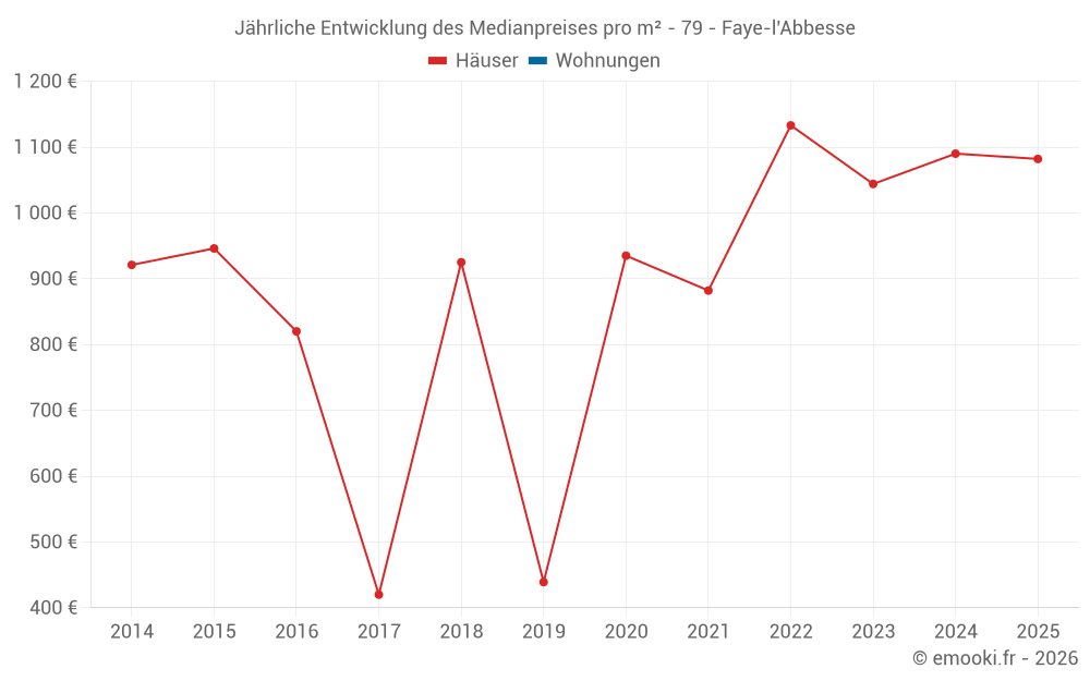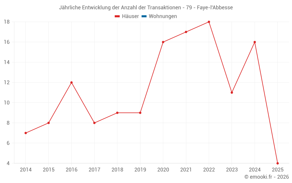 Der Durchschnittspreis auf den 26 Hausgeschäften der letzten 24 Monate in der Gemeinde Faye-l'Abbesse betrug 967 € pro Quadratmeter für einen mittleren Immobilienwert von 100 425 €. Über diesen Zeitraum hinweg lagen 60% der Transaktionen zwischen 539 und 1 470 € pro Quadratmeter (vom 2. bis zum 8. Dezil).