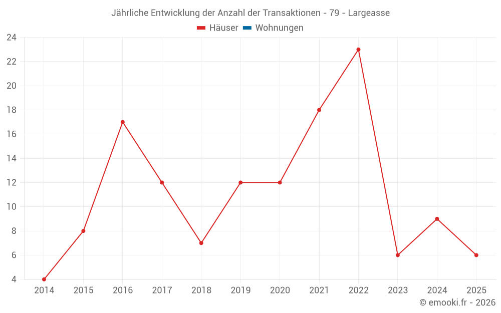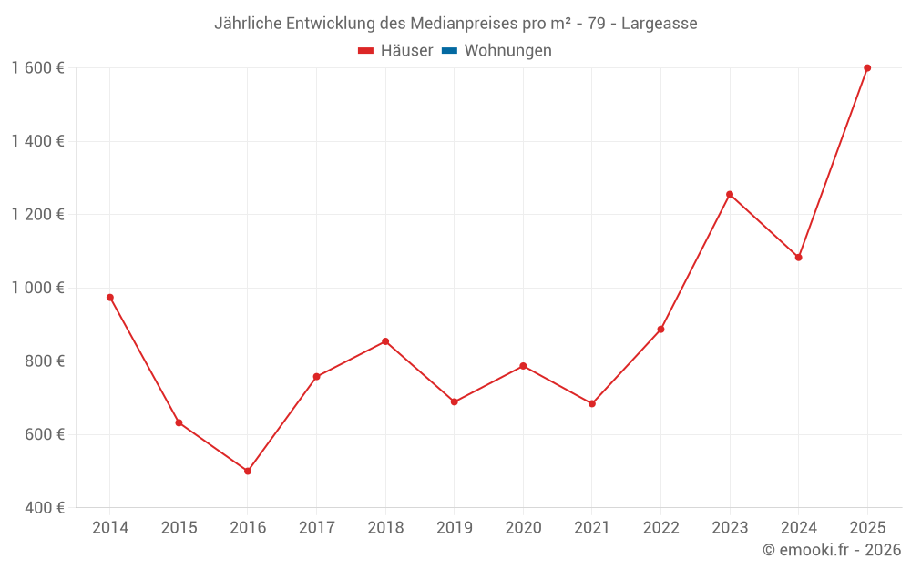 Der Durchschnittspreis auf den 19 Hausgeschäften der letzten 24 Monate in der Gemeinde Largeasse betrug 1 261 € pro Quadratmeter für einen mittleren Immobilienwert von 130 000 €. Über diesen Zeitraum hinweg lagen 60% der Transaktionen zwischen 810 und 1 594 € pro Quadratmeter (vom 2. bis zum 8. Dezil).