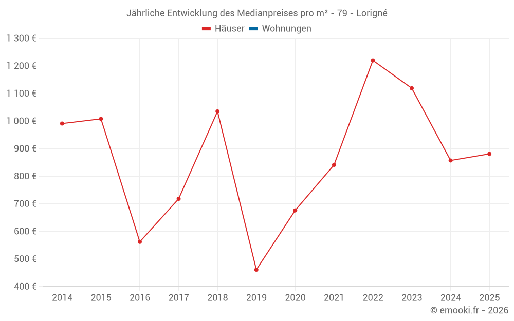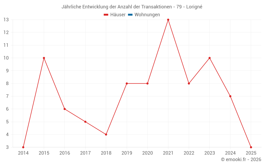 Der Durchschnittspreis auf den 16 Hausgeschäften der letzten 24 Monate in der Gemeinde Lorigné betrug 890 € pro Quadratmeter für einen mittleren Immobilienwert von 107 150 €. Über diesen Zeitraum hinweg lagen 60% der Transaktionen zwischen 630 und 1 295 € pro Quadratmeter (vom 2. bis zum 8. Dezil).