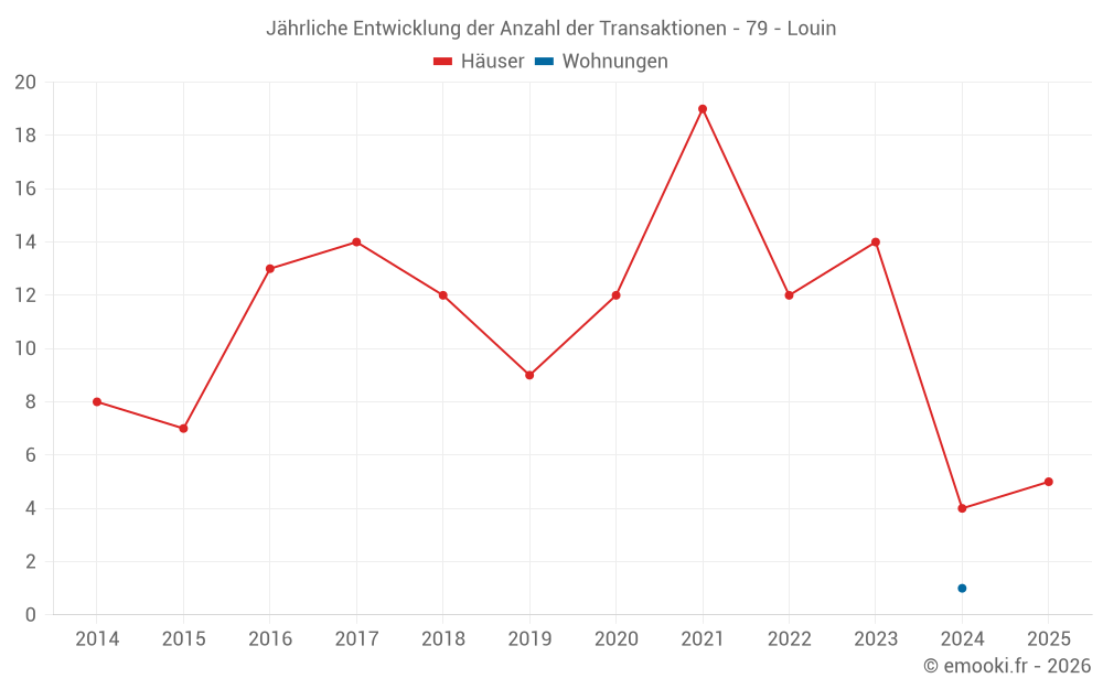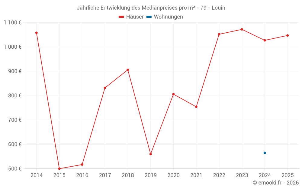 Der Durchschnittspreis auf den 15 Hausgeschäften der letzten 24 Monate in der Gemeinde Louin betrug 1 047 € pro Quadratmeter für einen mittleren Immobilienwert von 81 150 €. Über diesen Zeitraum hinweg lagen 60% der Transaktionen zwischen 741 und 1 330 € pro Quadratmeter (vom 2. bis zum 8. Dezil).