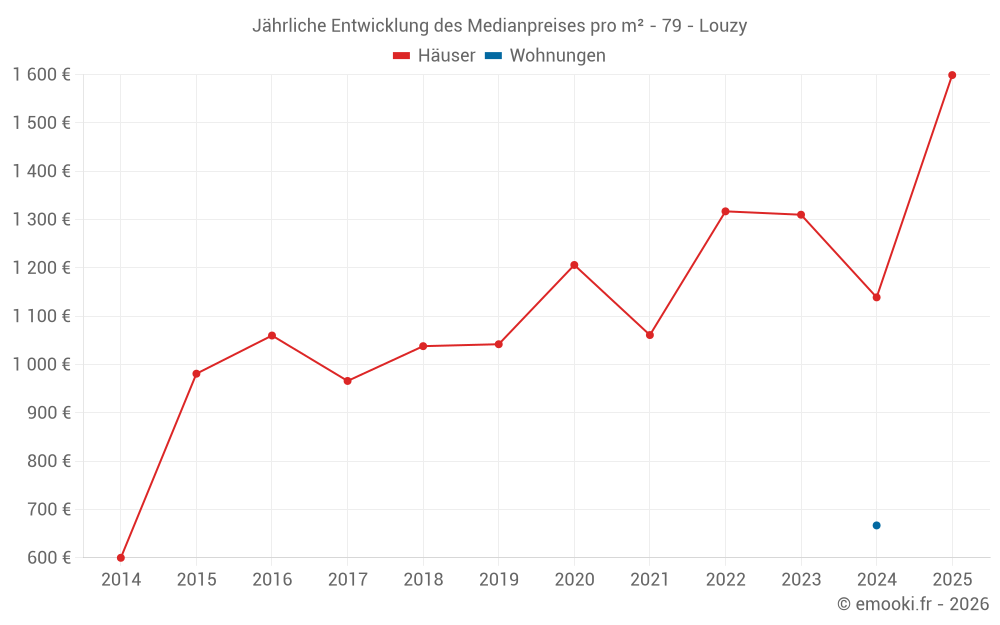 Der Durchschnittspreis auf den 28 Hausgeschäften der letzten 24 Monate in der Gemeinde Louzy betrug 1 240 € pro Quadratmeter für einen mittleren Immobilienwert von 116 575 €. Über diesen Zeitraum hinweg lagen 60% der Transaktionen zwischen 917 und 1 621 € pro Quadratmeter (vom 2. bis zum 8. Dezil).