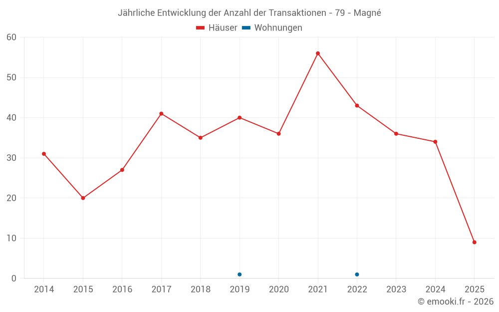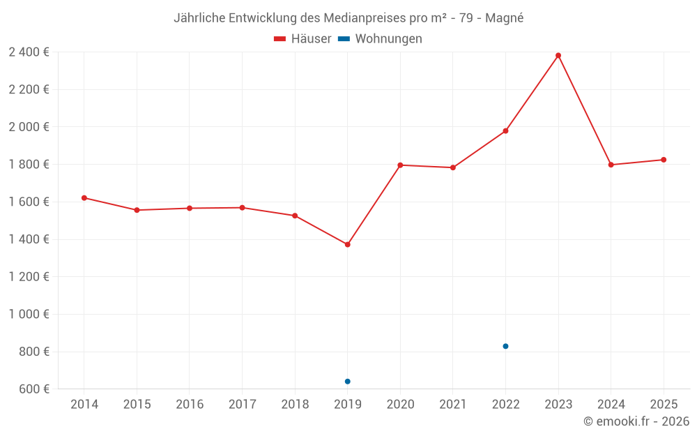 Der Durchschnittspreis auf den 30 Hausgeschäften der letzten 12 Monate in der Gemeinde Magné betrug 1 815 € pro Quadratmeter für einen mittleren Immobilienwert von 182 500 €. Über diesen Zeitraum hinweg lagen 60% der Transaktionen zwischen 1 199 und 2 263 € pro Quadratmeter (vom 2. bis zum 8. Dezil).