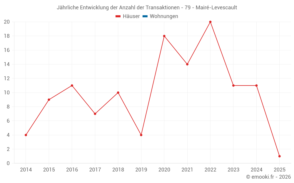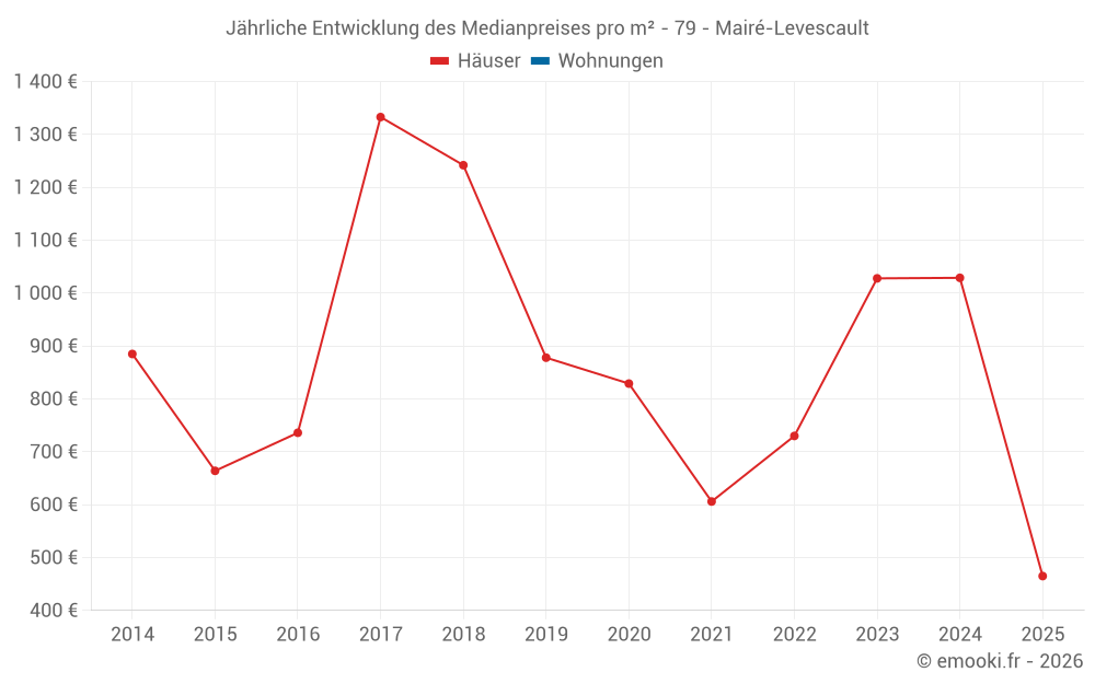 Der Durchschnittspreis auf den 18 Hausgeschäften der letzten 24 Monate in der Gemeinde Mairé-Levescault betrug 1 020 € pro Quadratmeter für einen mittleren Immobilienwert von 104 675 €. Über diesen Zeitraum hinweg lagen 60% der Transaktionen zwischen 629 und 1 283 € pro Quadratmeter (vom 2. bis zum 8. Dezil).