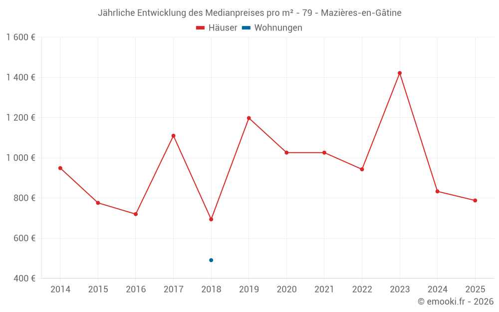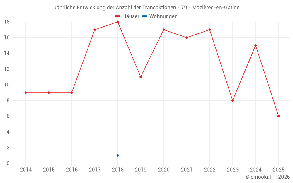 Der Durchschnittspreis auf den 27 Hausgeschäften der letzten 24 Monate in der Gemeinde Mazières-en-Gâtine betrug 924 € pro Quadratmeter für einen mittleren Immobilienwert von 95 230 €. Über diesen Zeitraum hinweg lagen 60% der Transaktionen zwischen 615 und 1 324 € pro Quadratmeter (vom 2. bis zum 8. Dezil).
