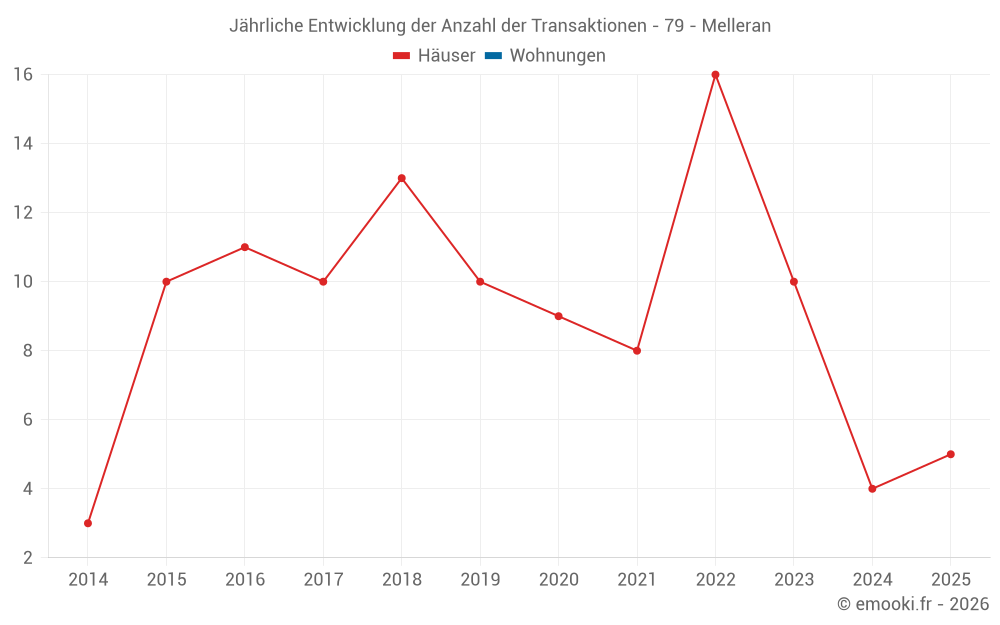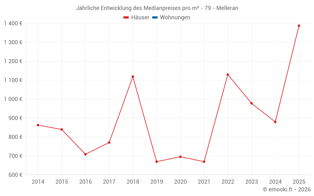 Der Durchschnittspreis auf den 14 Hausgeschäften der letzten 24 Monate in der Gemeinde Melleran betrug 978 € pro Quadratmeter für einen mittleren Immobilienwert von 145 100 €. Über diesen Zeitraum hinweg lagen 60% der Transaktionen zwischen 775 und 1 433 € pro Quadratmeter (vom 2. bis zum 8. Dezil).