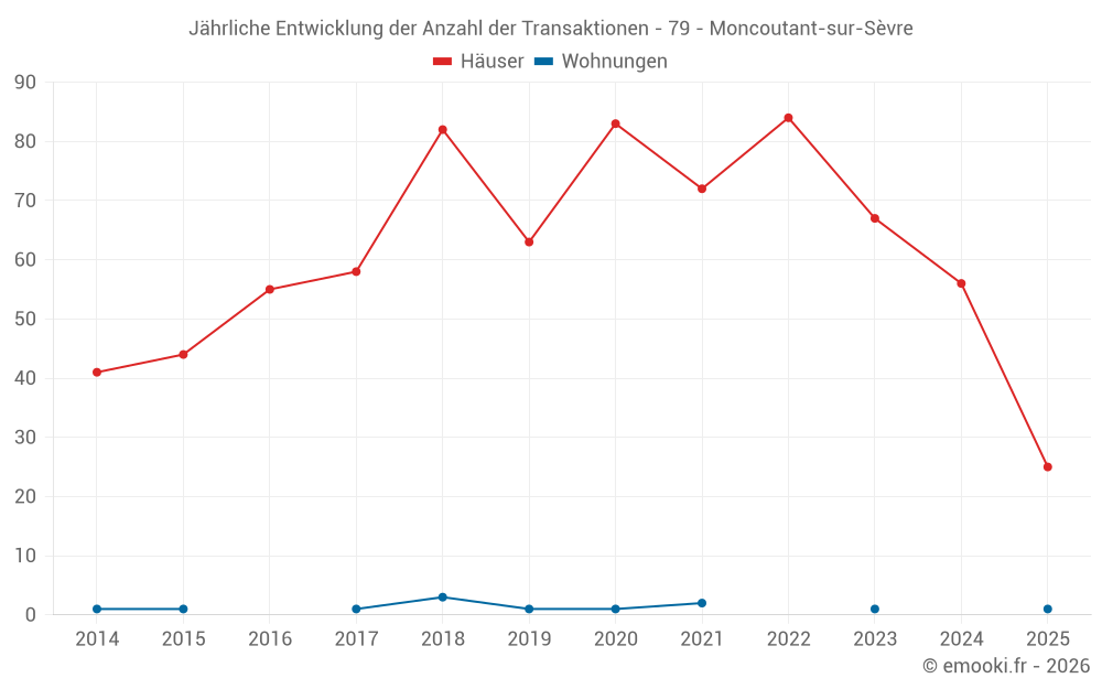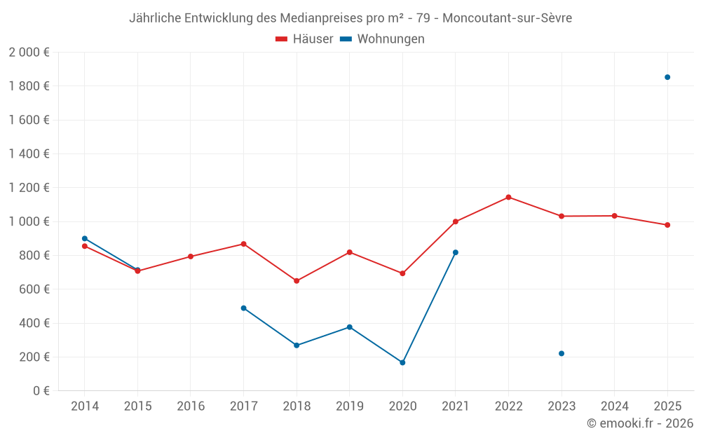 Der Durchschnittspreis auf den 25 Hausgeschäften der letzten 6 Monate in der Gemeinde Moncoutant-sur-Sèvre betrug 980 € pro Quadratmeter für einen mittleren Immobilienwert von 136 000 €. Über diesen Zeitraum hinweg lagen 60% der Transaktionen zwischen 731 und 1 361 € pro Quadratmeter (vom 2. bis zum 8. Dezil).