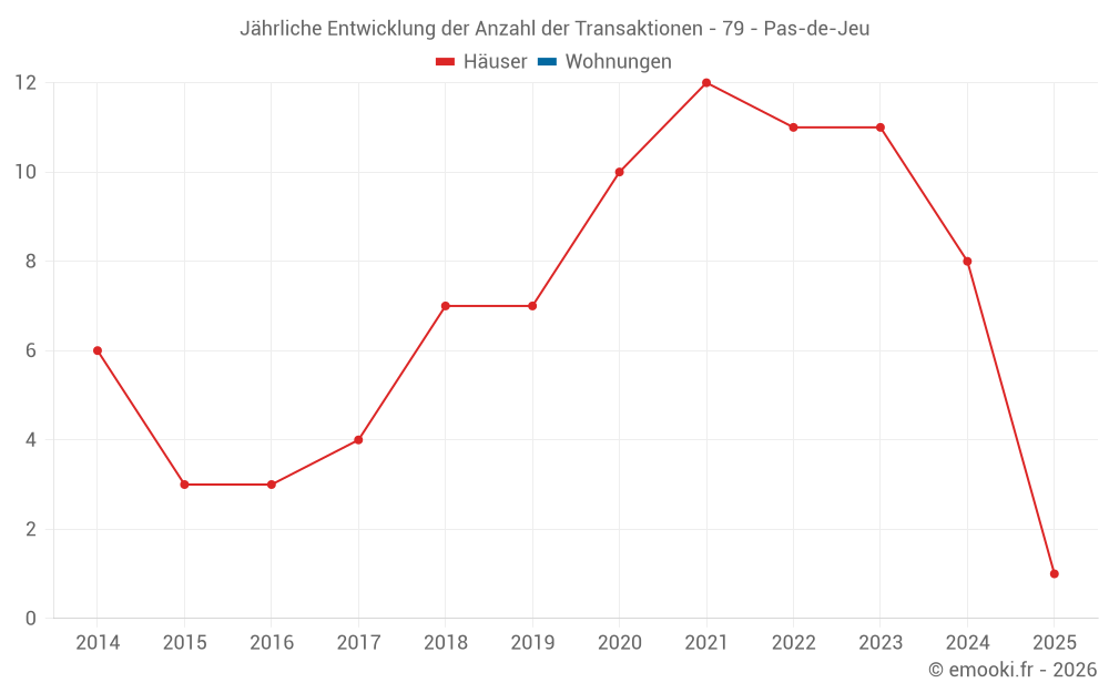Der Durchschnittspreis auf den 15 Hausgeschäften der letzten 24 Monate in der Gemeinde Pas-de-Jeu betrug 821 € pro Quadratmeter für einen mittleren Immobilienwert von 85 000 €. Über diesen Zeitraum hinweg lagen 60% der Transaktionen zwischen 365 und 1 468 € pro Quadratmeter (vom 2. bis zum 8. Dezil).