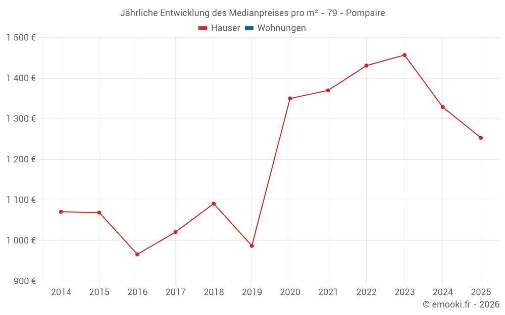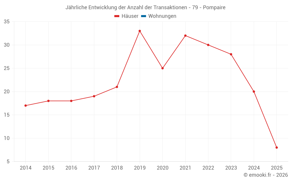 Der Durchschnittspreis auf den 19 Hausgeschäften der letzten 12 Monate in der Gemeinde Pompaire betrug 1 264 € pro Quadratmeter für einen mittleren Immobilienwert von 115 000 €. Über diesen Zeitraum hinweg lagen 60% der Transaktionen zwischen 655 und 1 834 € pro Quadratmeter (vom 2. bis zum 8. Dezil).