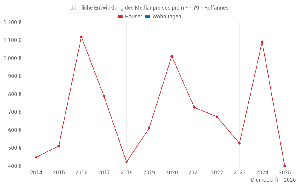 Der Durchschnittspreis auf den 15 Hausgeschäften der letzten 24 Monate in der Gemeinde Reffannes betrug 677 € pro Quadratmeter für einen mittleren Immobilienwert von 69 000 €. Über diesen Zeitraum hinweg lagen 60% der Transaktionen zwischen 508 und 1 384 € pro Quadratmeter (vom 2. bis zum 8. Dezil).