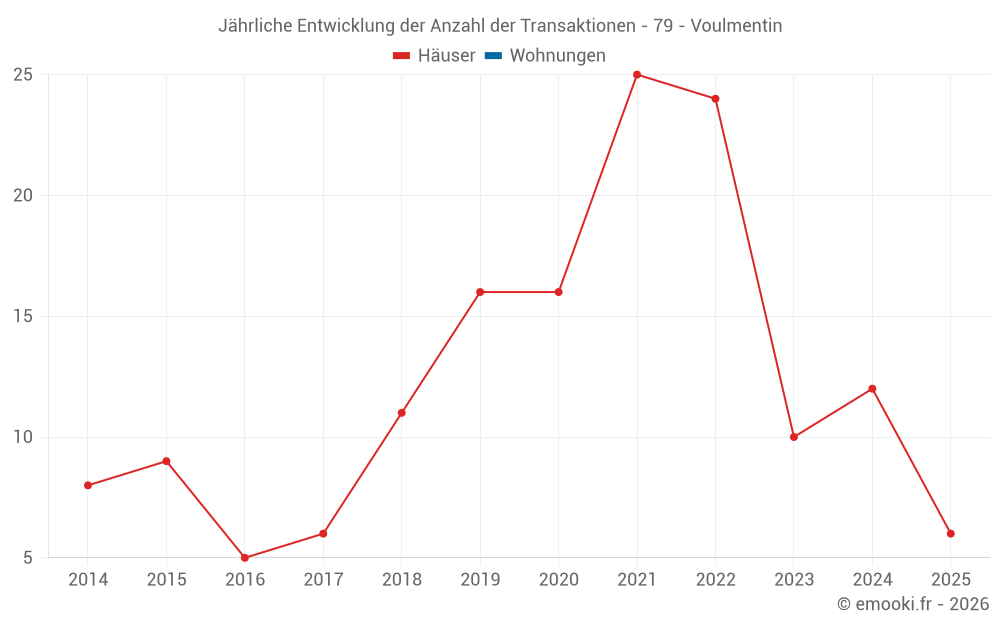 Der Durchschnittspreis auf den 24 Hausgeschäften der letzten 24 Monate in der Gemeinde Voulmentin betrug 1 050 € pro Quadratmeter für einen mittleren Immobilienwert von 116 913 €. Über diesen Zeitraum hinweg lagen 60% der Transaktionen zwischen 720 und 1 445 € pro Quadratmeter (vom 2. bis zum 8. Dezil).