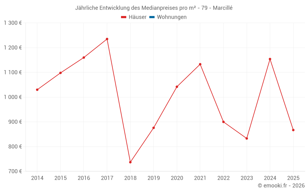 Der Durchschnittspreis auf den 16 Hausgeschäften der letzten 12 Monate in der Gemeinde Marcillé betrug 1 102 € pro Quadratmeter für einen mittleren Immobilienwert von 100 000 €. Über diesen Zeitraum hinweg lagen 60% der Transaktionen zwischen 721 und 1 339 € pro Quadratmeter (vom 2. bis zum 8. Dezil).