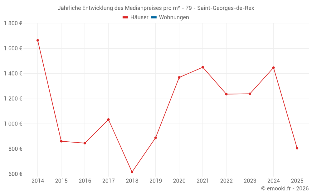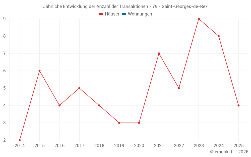 Der Durchschnittspreis auf den 16 Hausgeschäften der letzten 24 Monate in der Gemeinde Saint-Georges-de-Rex betrug 1 058 € pro Quadratmeter für einen mittleren Immobilienwert von 78 144 €. Über diesen Zeitraum hinweg lagen 60% der Transaktionen zwischen 597 und 1 505 € pro Quadratmeter (vom 2. bis zum 8. Dezil).