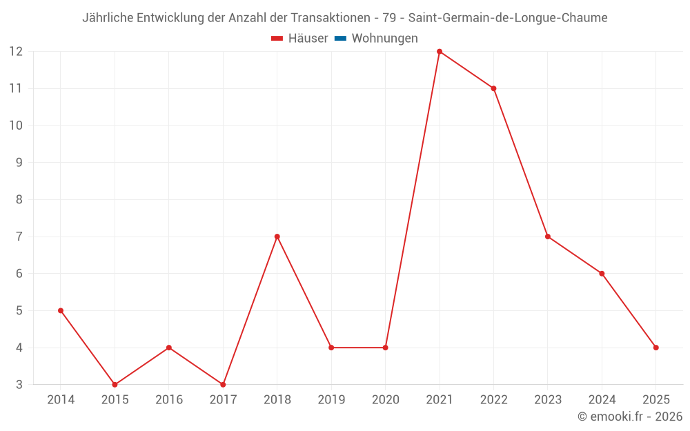 Der Durchschnittspreis auf den 14 Hausgeschäften der letzten 24 Monate in der Gemeinde Saint-Germain-de-Longue-Chaume betrug 898 € pro Quadratmeter für einen mittleren Immobilienwert von 75 000 €. Über diesen Zeitraum hinweg lagen 60% der Transaktionen zwischen 428 und 1 037 € pro Quadratmeter (vom 2. bis zum 8. Dezil).