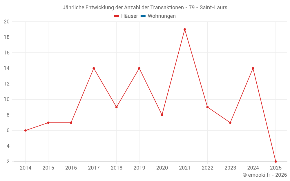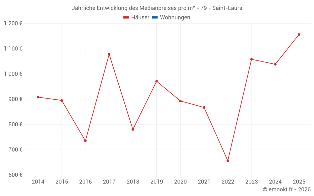 Der Durchschnittspreis auf den 21 Hausgeschäften der letzten 24 Monate in der Gemeinde Saint-Laurs betrug 1 053 € pro Quadratmeter für einen mittleren Immobilienwert von 115 000 €. Über diesen Zeitraum hinweg lagen 60% der Transaktionen zwischen 659 und 1 529 € pro Quadratmeter (vom 2. bis zum 8. Dezil).