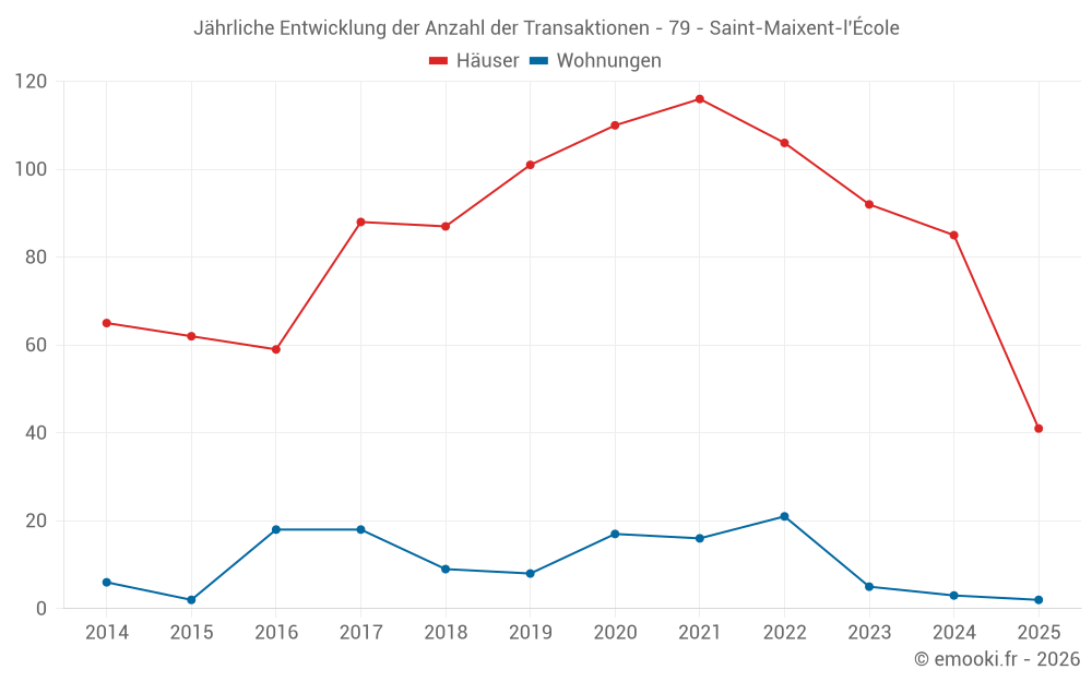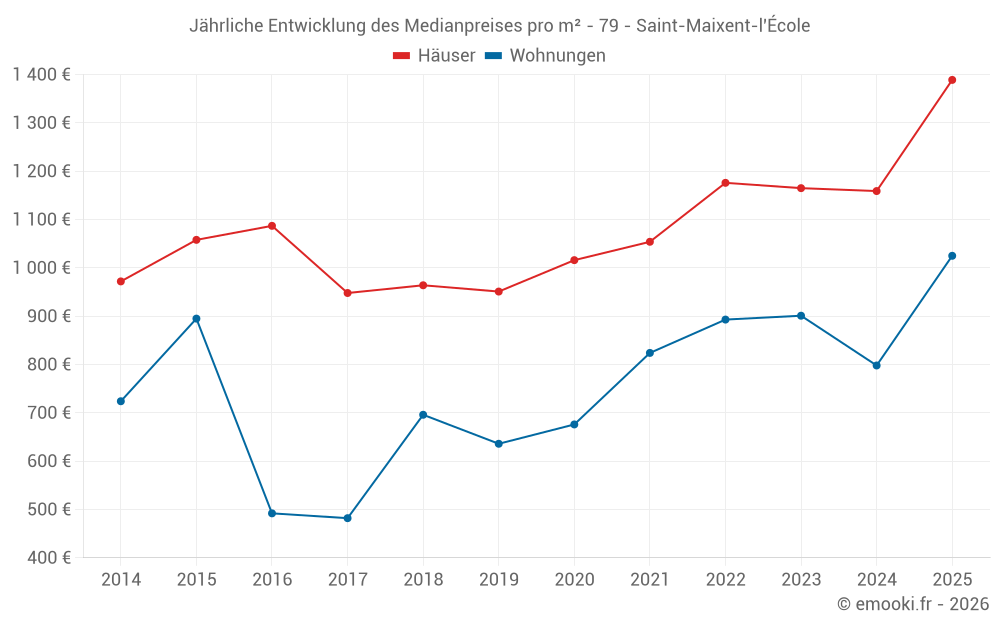 Der Durchschnittspreis auf den 41 Hausgeschäften der letzten 6 Monate in der Gemeinde Saint-Maixent-l'École betrug 1 389 € pro Quadratmeter für einen mittleren Immobilienwert von 135 000 €. Über diesen Zeitraum hinweg lagen 60% der Transaktionen zwischen 900 und 1 782 € pro Quadratmeter (vom 2. bis zum 8. Dezil).